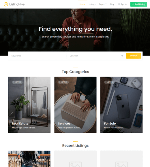ListingHive 是最好的免费房地产 WordPress 主题之一,拥有 9000+ 个活跃安装。该主题的重点是提供功能齐全的房地产网站所需的简单而有效的软件包。此外,它还与强大的 HivePress 插件深度集成,允许创建信息丰富的房产列表。