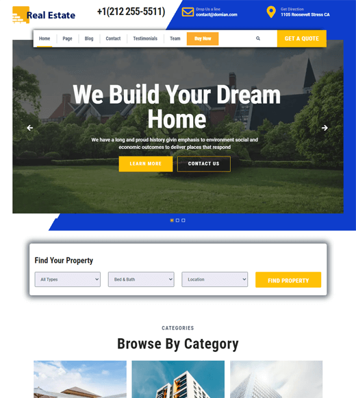 如果您想建立强大的房地产业务,Construction Realestate 是免费下载的完美 WordPress 房地产网站模板之一。除了房地产经纪人,它也是建筑商、承包商、发明家等的理想选择。此外,这个 SEO 友好的主题肯定会帮助您的网站排名靠前。