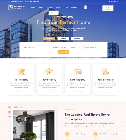 这是一个轻量级的主题,设计简洁简约。此外,ListingHive 还提供预构建的演示。因此,您可以导入演示并立即开始构建您的房地产网站。