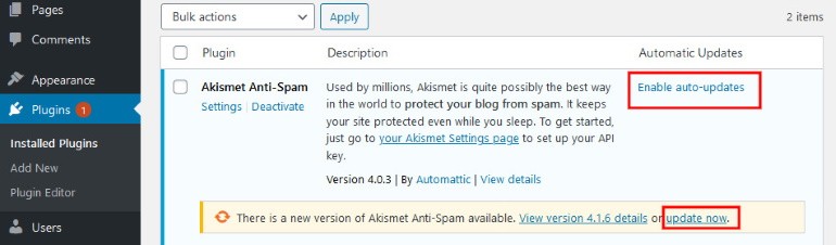 或者,您可以从 WordPress 仪表板转到插件。在那里,您会在每个过时的插件下方看到一条通知。只需单击“立即更新”即可安装更新。如果你不想