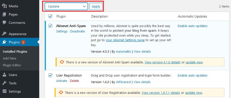 您可能会在网站上同时获得多个插件更新。在这种情况下,您可以选择它们并使用“批量作”下拉列表并选择更新。只需单击“应用”,您就可以开始了!
