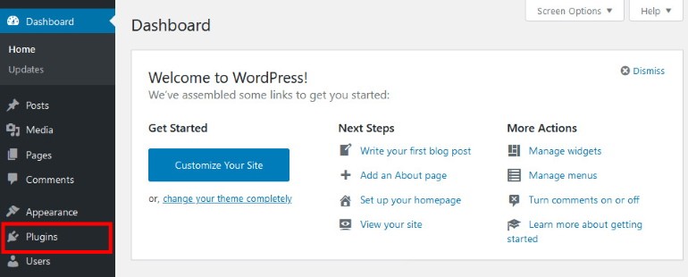 这将带您进入 WordPress 仪表板。从这里,转到侧边栏菜单中的“插件”选项。