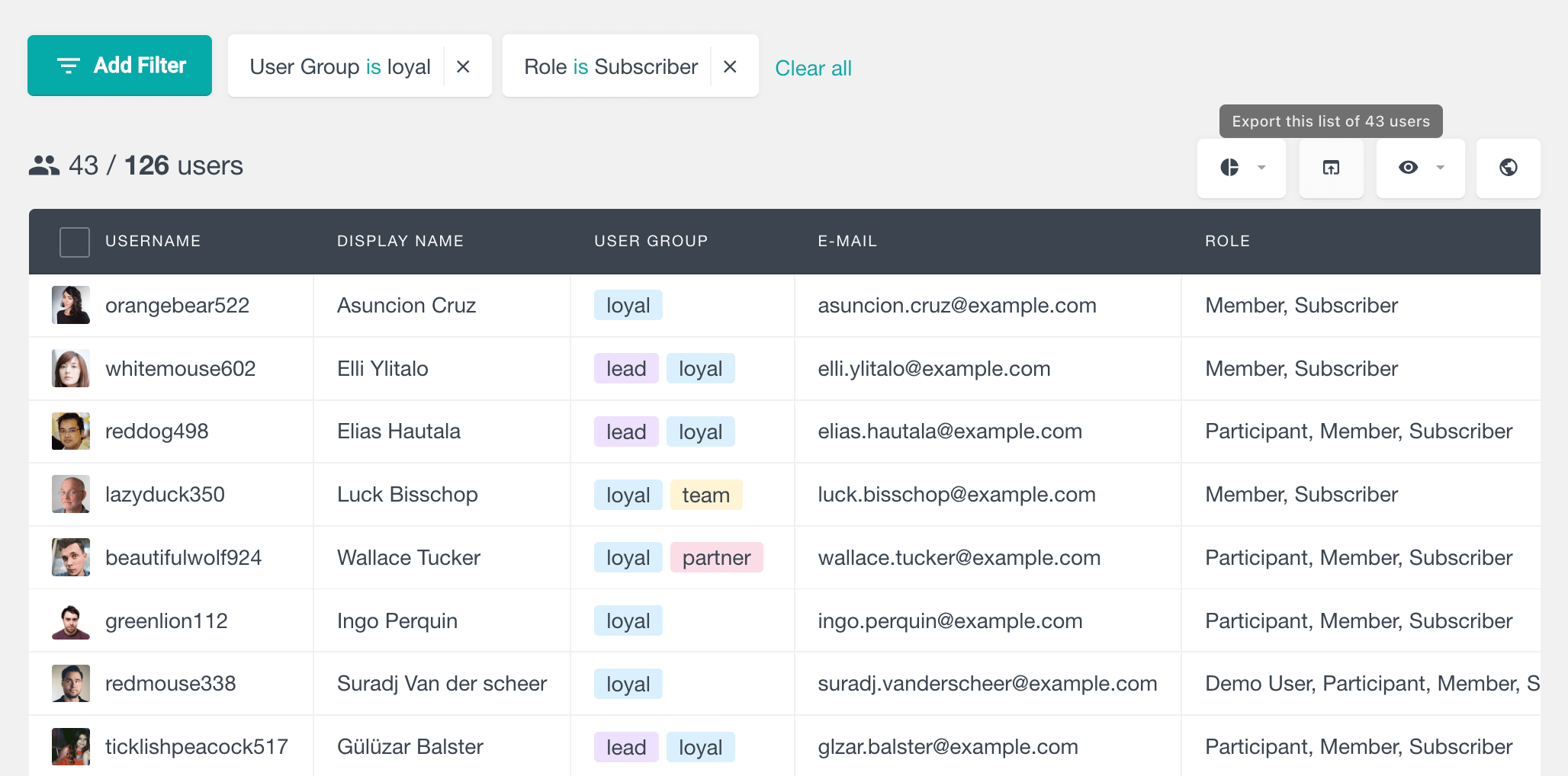 创建好组后,应用你想要的筛选条件,然后点击“用户名”栏附近的按钮,选择当前页面上的所有用户。你也可以点击每个用户的头像,添加或移除他们: